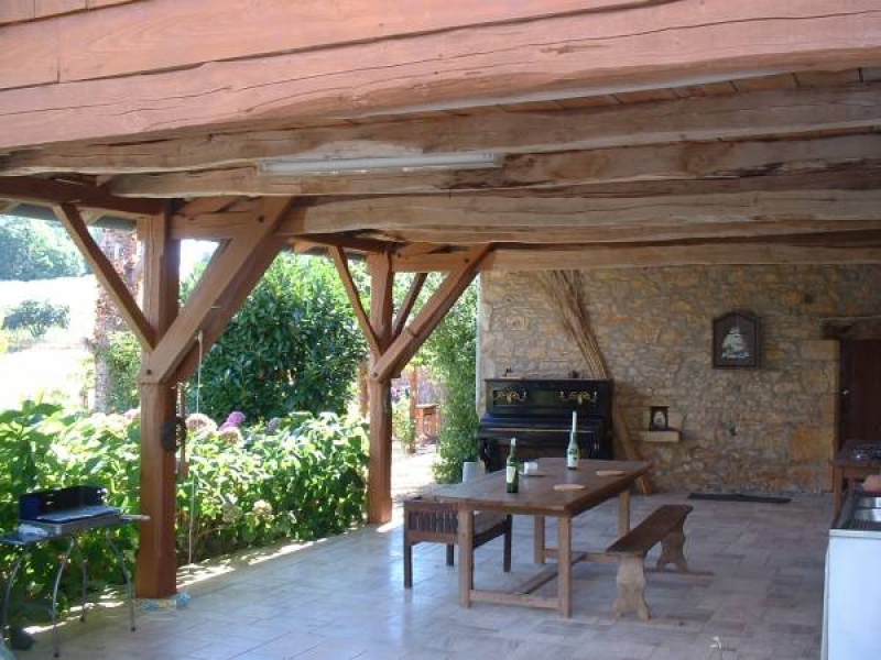 Rear large covered terrace with rustic stone walls and traditional beams, ideal for outside dining whatever the weather Relax around the farmhouse table, light the barbeque and pour a glass of wine, if you are lucky you may spot a deer or Hawks flying from tree to tree. If you step outside at night, you will be amazed at the sky The Lot is the least light polluted area in Europe, Thousands of twinkling stars ,satellites,meteor showers await the patient gazer. Bring your binoculars!!